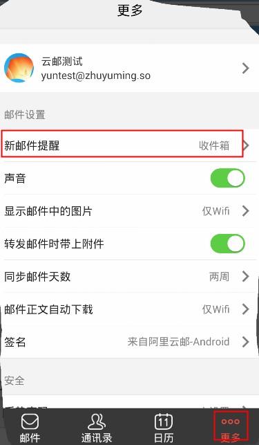 安卓版阿里云邮APP【点击下载】支持新邮件自动提醒功能,设置方法如下: