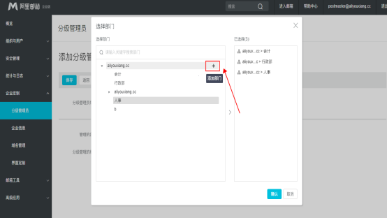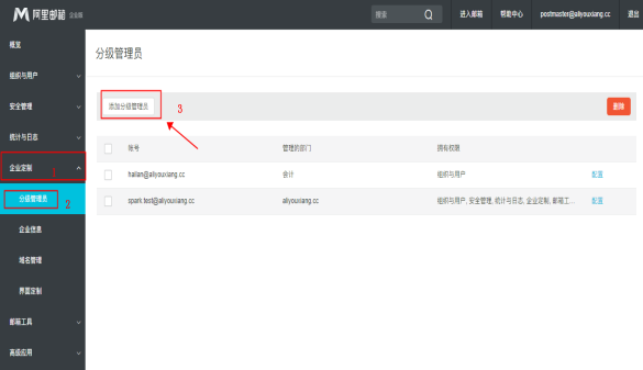 1. 登录postmaster管理员后台(分级管理员有且只有该管理账号可以设置),选择左侧栏目安全管理》分级管理员,点击添加分级管理员。